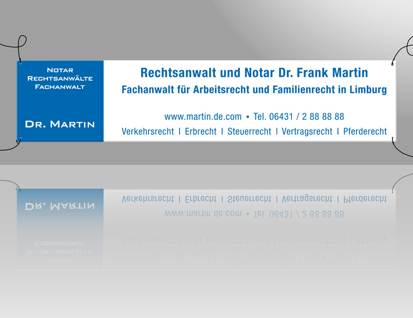 Das neu entwickelte Logo steht als Wortmarke für den guten Namen der Kanzlei Dr. Martin und beinhaltet gleichzeitig die Qualifikationen der Anwälte. Die Anzeigen sind klar im Aufbau gegliedert und die Produkte für Außenwerbung erscheinen in dem markanten Blau des Logos.