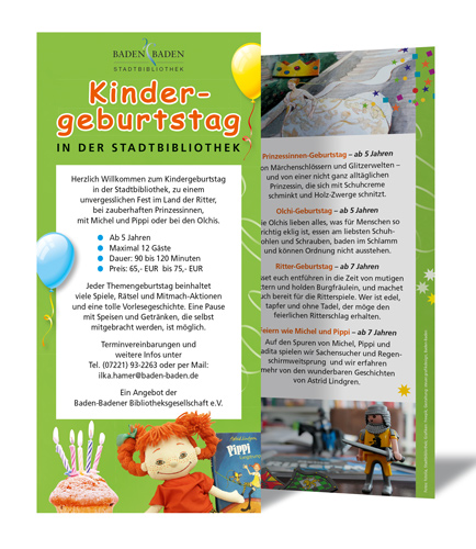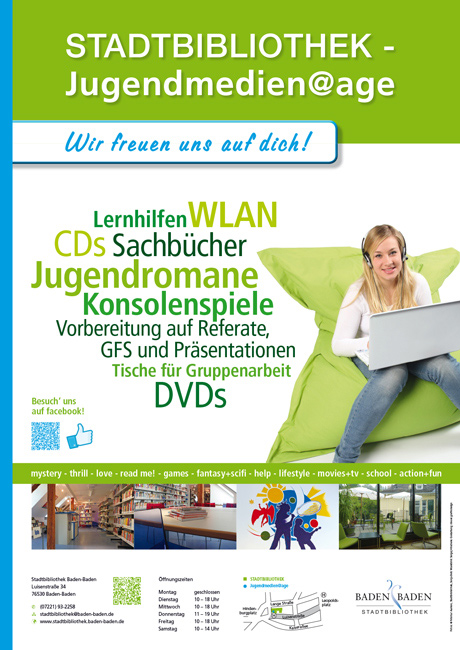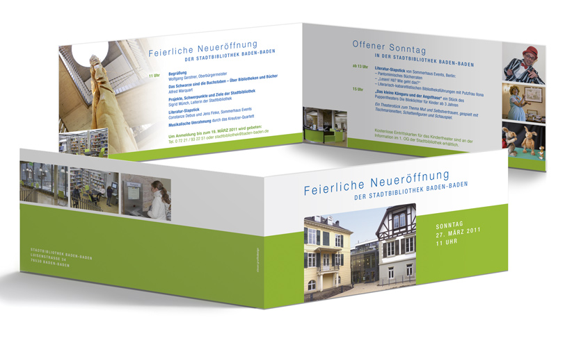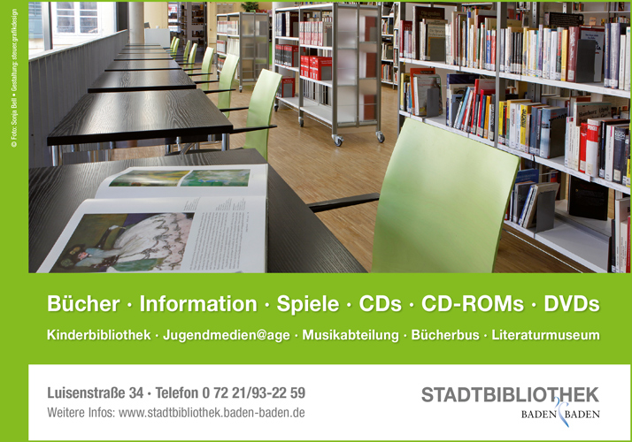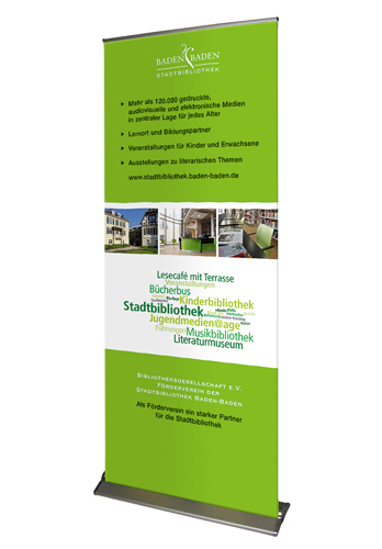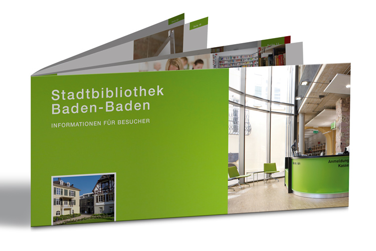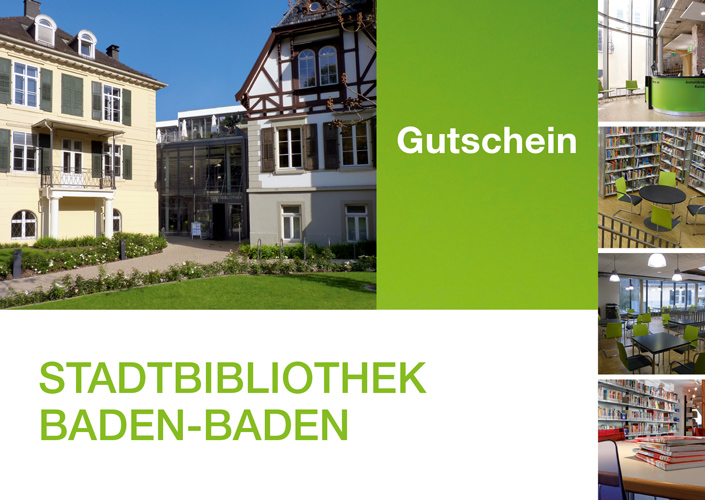 Die Stadtbibliothek Baden-Baden ist ein lebendiger Kulturstandort mit einer umfassenden Medienbibliothek. Vielfältiges Engagement, so Lesungen über und von Autoren, Vorträge, Workshops mit Kindern und Jugendlichen, Seminare sowie Ausstellungen im Literaturmuseum leisten einen wichtigen Beitrag für Bildung und Kultur. Mit der Neueröffnung wurde ein Relaunch für alle grafischen Arbeiten in Auftrag gegeben: Ein frisches Grün und ein klares Design bestimmen nun das optische Erscheinungsbild.
