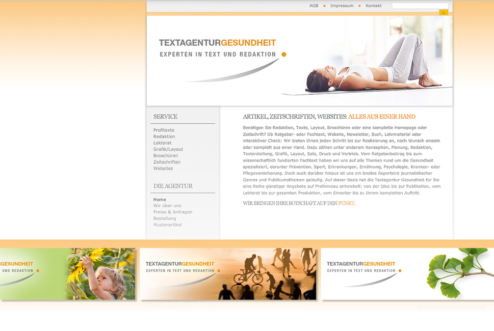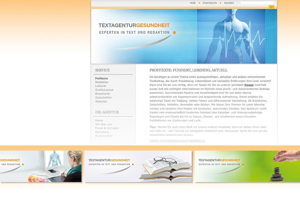 Mit illustrativen Foto Composings, die als Werbebanner auf der Homepage gezeigt werden, visualisiert die Textagentur Gesundheit die redaktionellen Themengebiete und das vielseitige Angebot an Dienstleistungen.